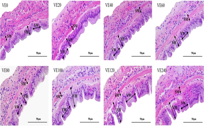 Microscope images of shrimp intestines from the study reveal that VE80, showing increased villi height (VH), represents an optimal addition of vitamin E compared to no Vitamin E (VE0).