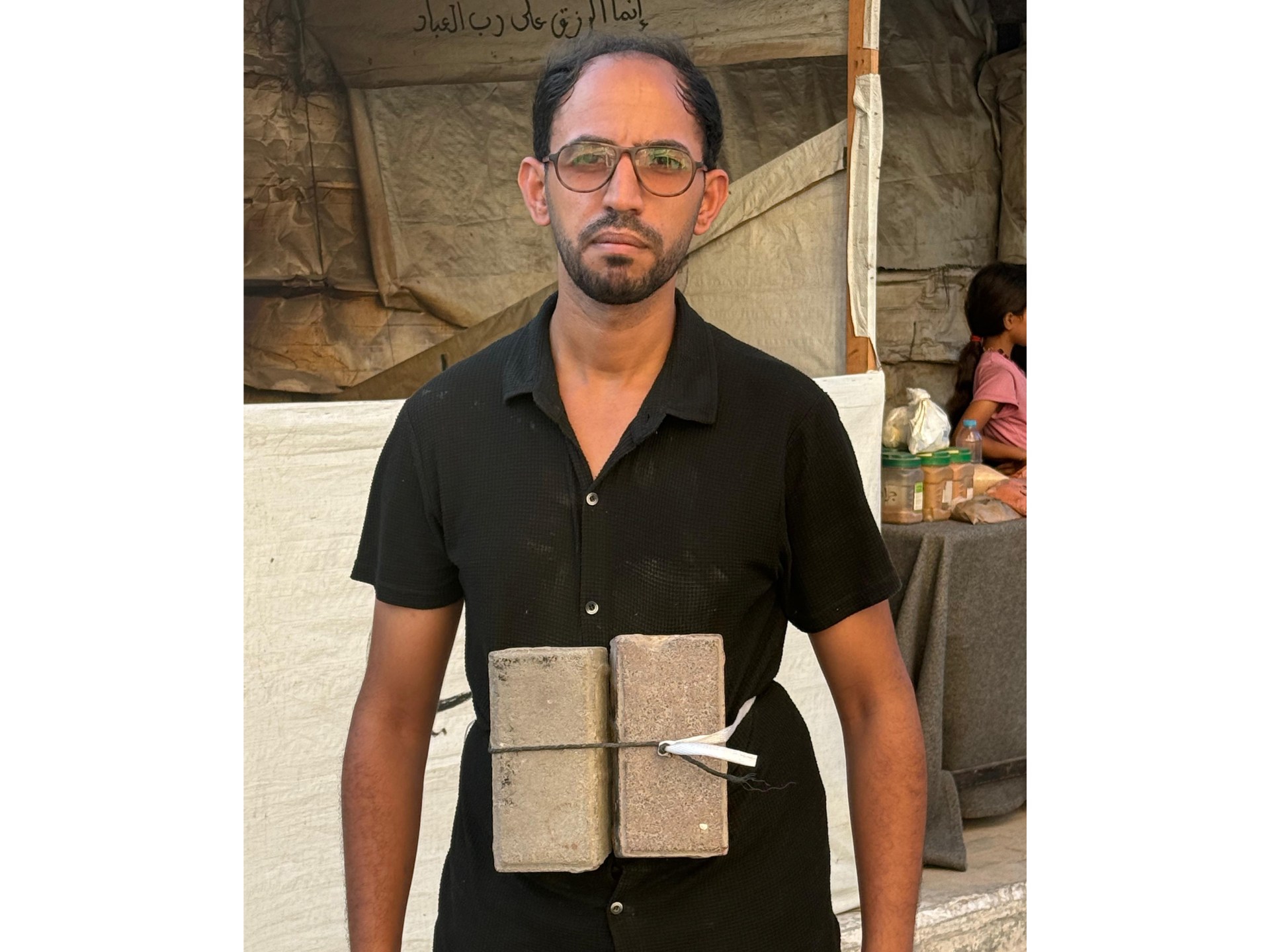 Gaza City, Gaza Strip – Hani Abu Rizq walks through Gaza City’s wrecked streets with two bricks tied against his stomach as the rope cuts into his clothes, which hang loose from the weight he has lost.