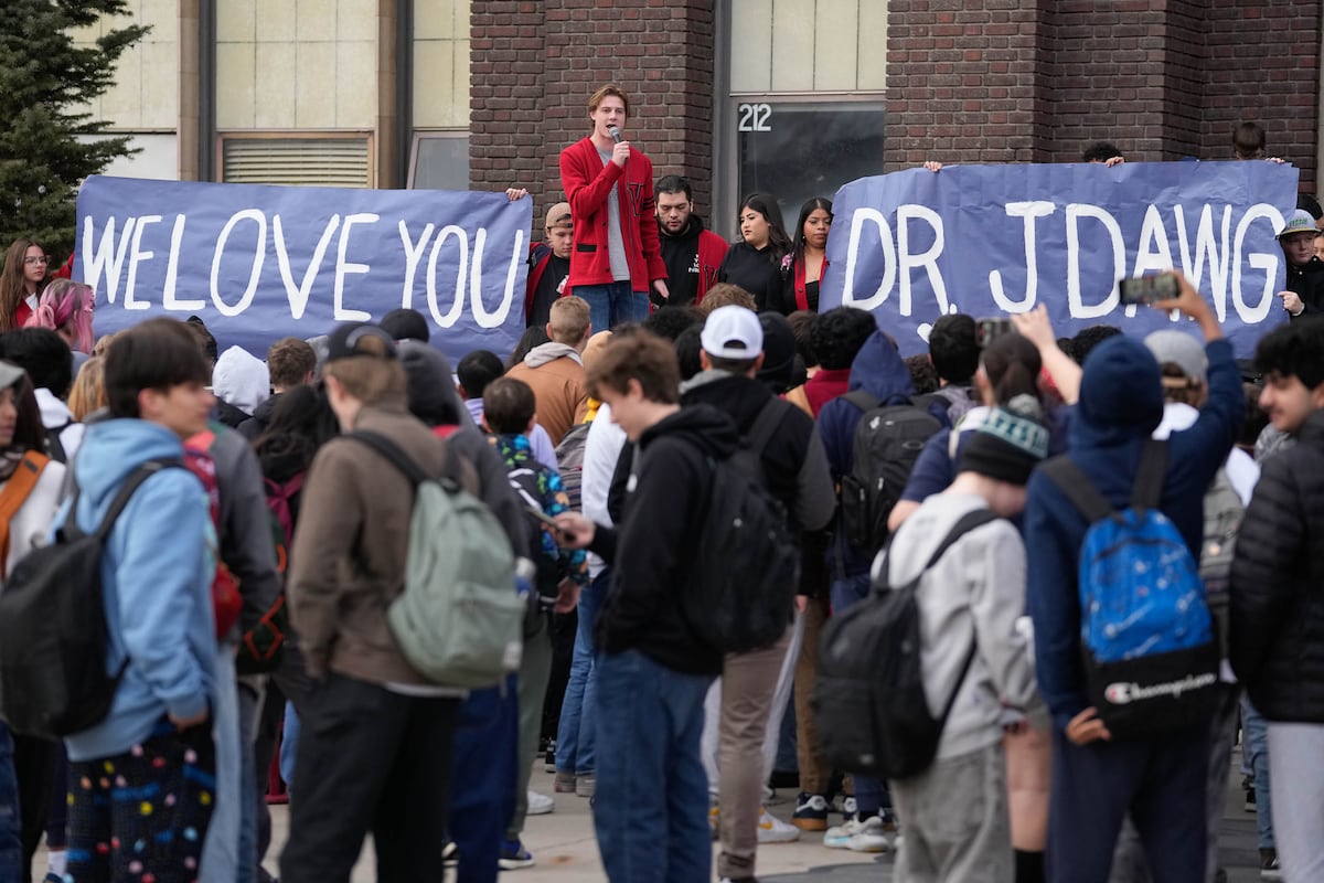 (Francisco Kjolseth | The Salt Lake Tribune) West High students stage a walkout in support of Principal Jared Wright, who was recently placed on administrative leave without explanation, Friday, Jan. 17, 2025.