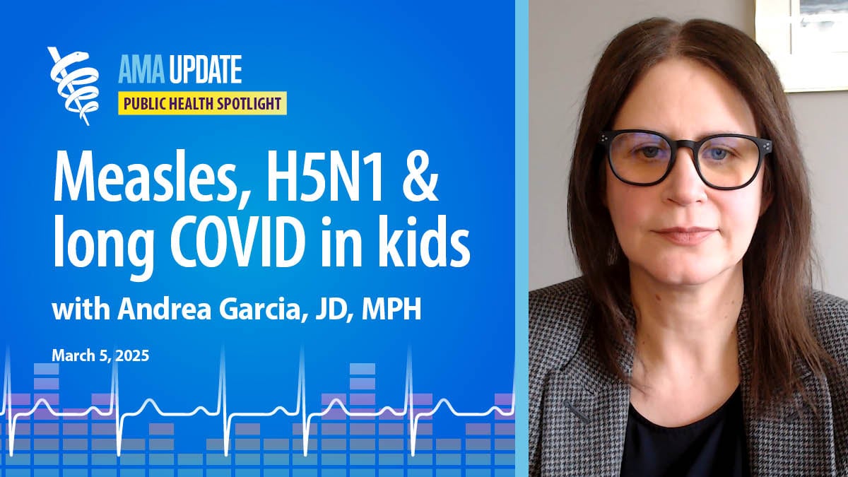 AMA’s Vice President of Science, Medicine and Public Health, Andrea Garcia, JD, MPH, discusses the ongoing measles outbreak in Texas, USDA’s bird flu response, new research on long COVID in kids, as well as FDA canceling a flu vaccines meeting. AMA Chief Experience Officer Todd Unger hosts.