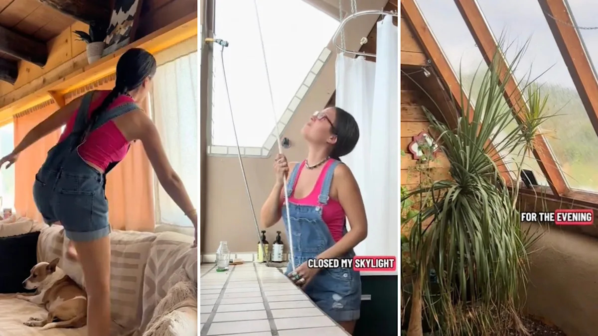 At the end of the video, she returns to her home and shows a quick view of her skylight and the rainstorm that rolled in.