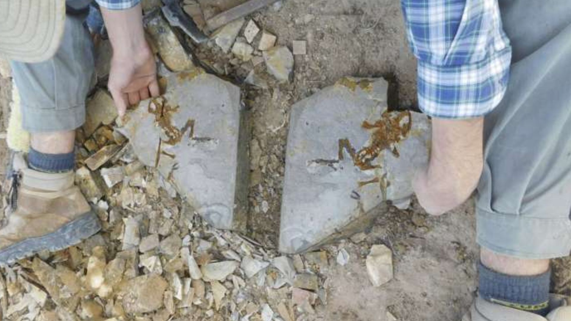Embedded in a sandstone slab are fragments of the tadpole’s skull and spine and markings of its eyes and nerves.